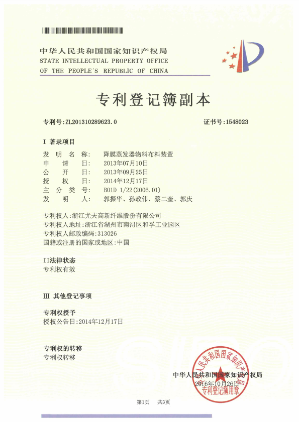 降膜蒸發(fā)器物料布料裝置 受讓專利登記簿